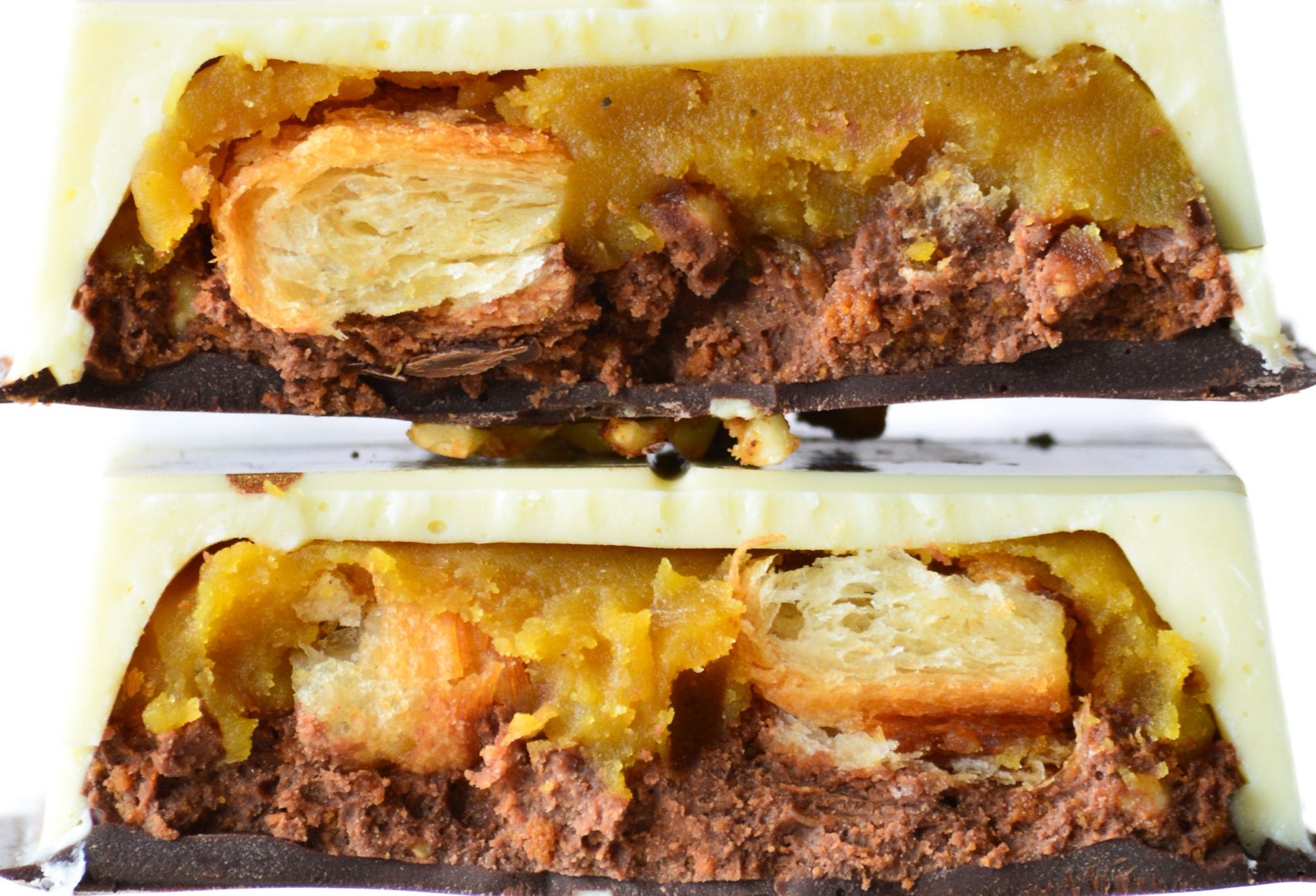A passionate reimagining of the Hyderabadi pooran poori. Slow cooked Bengal gram, gently perfumed with bloomed Kashmiri and Irani saffron, freshly ground cardamom, rich ghee, brown butter, and a trio of sugars, studded with slivered almonds. Encased in a white chocolate shell, layered with double baked croissant shards to echo the flaky poori, crowned with a saffron brown butter crunch of lotus biscuit and cardamom caramelised salted almond bits, and finished with a dark chocolate seal.