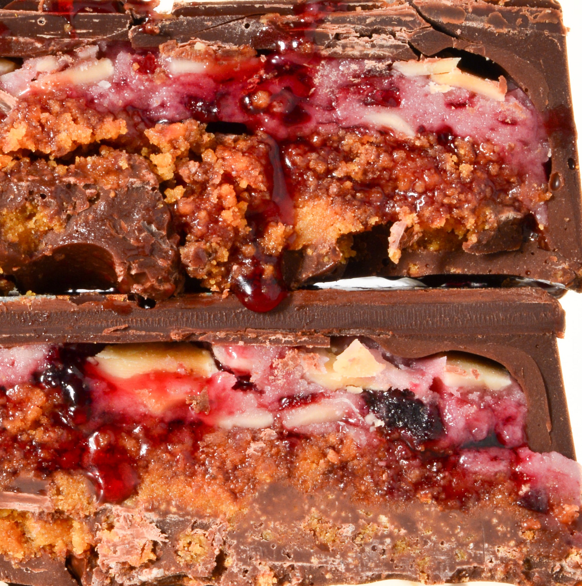 This bar begins with a soft marzipan–fondant layer, delicately folded with candied cherries made from our own in-house cherry syrup. A second layer of glossy cherry syrup follows, studded with ginger nuts and toasted slivered almonds, bringing warmth, depth and gentle spice.